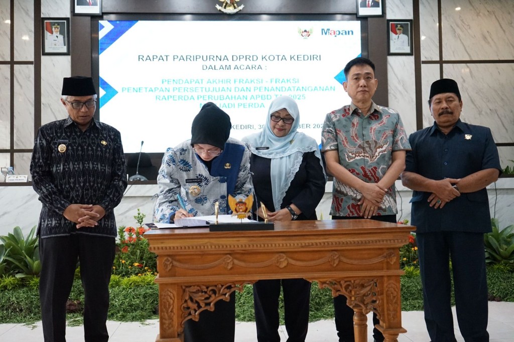 Kediri – Raperda tentang Perubahan APBD tahun anggaran 2025 disetujui sebagai Perda. Hal ini setelah Wali Kota Kediri Vinanda Prameswati bersama Pimpinan DPRD Kota Kediri menandatangani berita acara persetujuan bersama pada Rapat Paripurna, Selasa (30/9/2025) di Ruang Soekarno Hatta BKPSDM.