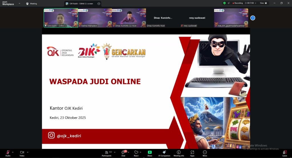 Kediri – Pemerintah Kota Kediri melalui Dinas Komunikasi dan Informatika menggelar Sosialisasi Pencegahan dan Penanggulangan Maraknya Judi Online bertema “Digital Sehat Tanpa Judi Online”, Kamis (23/10/2025). Kegiatan yang dilaksanakan secara daring ini menyasar ASN dan masyarakat umum. Sosialisasi menghadirkan narasumber dari Otoritas Jasa Keuangan (OJK) Kediri dan Dinas Sosial Kota Kediri.